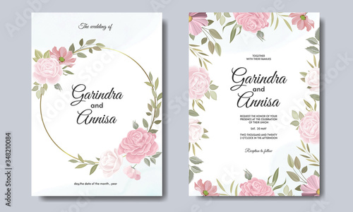 Elegant wedding invitation cards template with pink and blush roses design Premium Vector