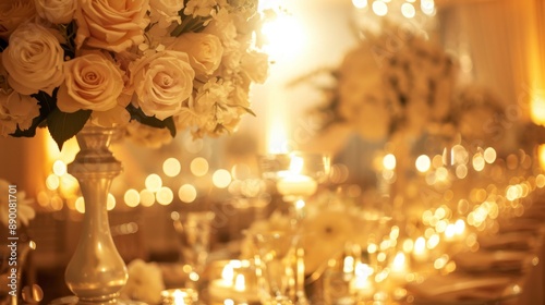 Elegant Wedding Reception Table Setting with Floral Arrangements and Warm Lighting