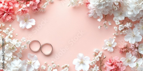 Elegant wedding rings surrounded by delicate white and pink flowers with a soft pastel background ideal for invitations or announcements.