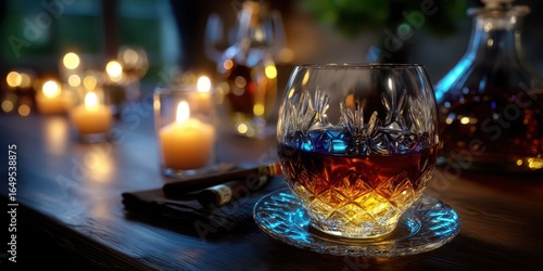 Elegant whiskey glass on a wooden table surrounded by candles at night creating a cozy atmosphere