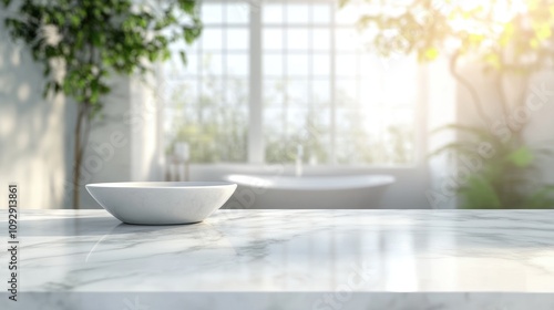 Elegant White Bowl on Marble Surface with Soft Natural Lighting in Cozy Bathroom Setting Surrounded by Greenery and View of Bathtub in Background