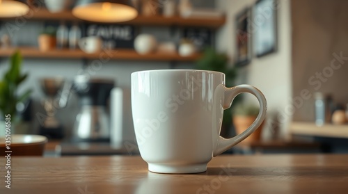 Elegant White Coffee Mug on Wood Countertop with Blurred Cafe Interior Setting