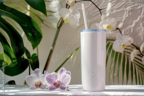Elegant White Drink Container Surrounded by Orchid Flowers