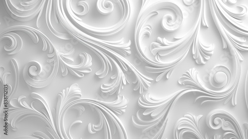 Elegant white embossed floral pattern wallpaper with intricate swirls and curves, perfect for interior design and decorative backgrounds.