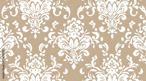 Elegant White Floral Damask Pattern on Beige Background