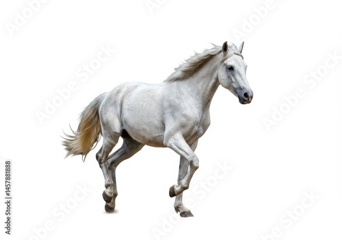 Elegant white horse trotting gracefully on a clean white background