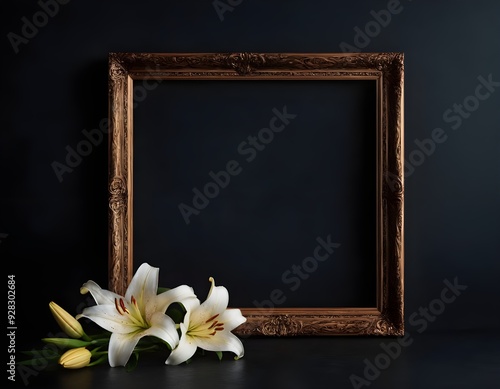 Elegant white lilies and green leaves arranged around a square frame on a dark background
