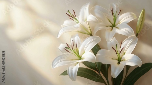 Elegant white lilies arranged on a light beige surface, ideal for calming designs, wedding invites, or Mother’s Day greetings. Emphasizes nature's beauty.