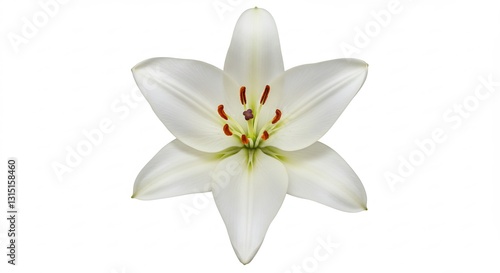 Elegant white lily blossoms softly illuminated against pure white background. AI Generated