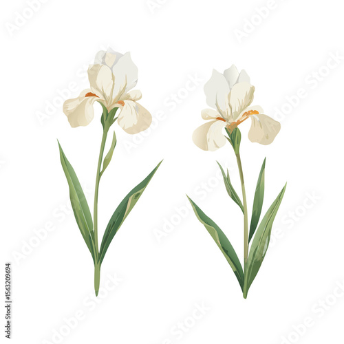 Elegant White or Cream Iris Flowers with Green Leaves Botanical Vector Art