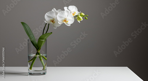 Elegant white orchid blooms in a clear glass vase, offering serene beauty and natural sophistication.