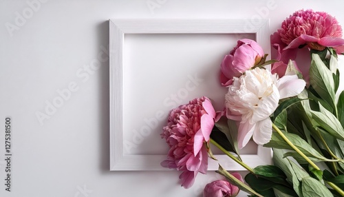 Elegant White Peony Bouquet in Square Frame Against a Crisp White Background, Radiant Serenity on a Boldly Minimalist Stage