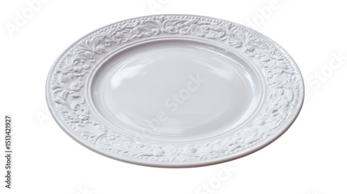 Elegant white plate with ornate rim, isolated on transparent background, PNG