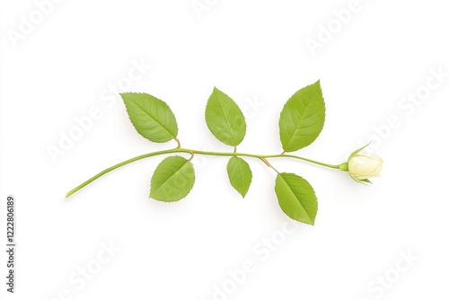 Elegant white rose with green leaves laid on a clean surface, symbolizing purity and freshness