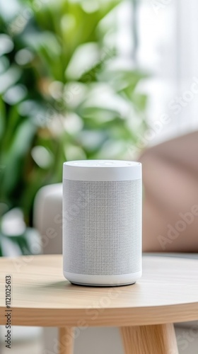 Elegant White Smart Speaker on Wooden Table Surrounded by Lush Green Plants in Modern Living Room Decor