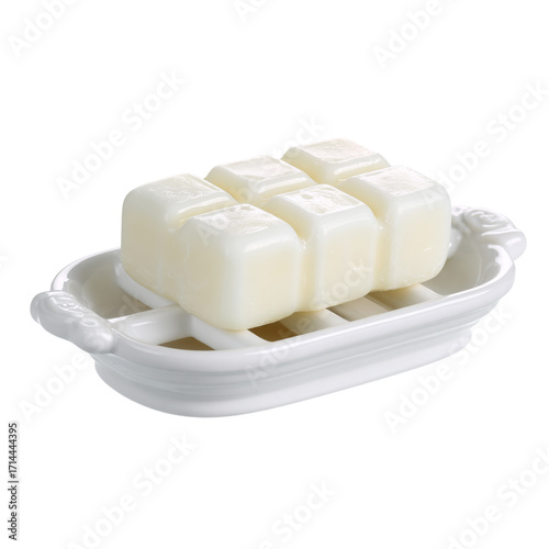Elegant white soap bar rests on a stylish ceramic soap dish, perfect for bathroom decor, spa branding, and personal care products