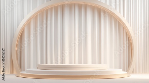 Elegant White Stage Design with Curved Arch and Draped Curtains