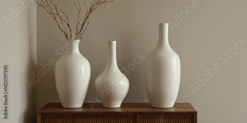 Elegant white vases on wooden cabinet with natural branch decor indoors