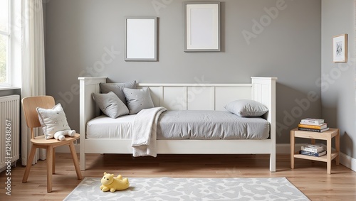 Elegant white wooden daybed with gray wall backdrop in a serene child's room, adorned with a cozy gray comforter, white blanket, and plush gray pillows for ultimate relaxation and style