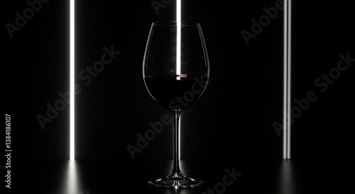 Elegant wine glass silhouette on black background with glowing light bars. Minimalist alcohol beverage presentation. Luxurious wine tasting concept for restaurant menu or bar advertisement.