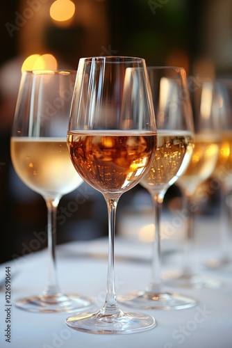 Elegant wine glasses filled with white and rose wine on a table with blurred background