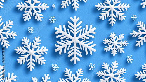 Elegant winter holiday background showing many delicate white snowflakes arranged on a light blue surface.