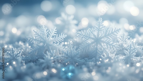 Elegant winter holiday themed background image with sparkling icy snowflakes and beautiful soft bokeh