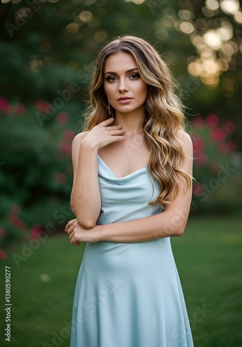 Elegant Woman in Blue Dress Posing Outdoors, Natural Beauty Portrait, Garden Background.