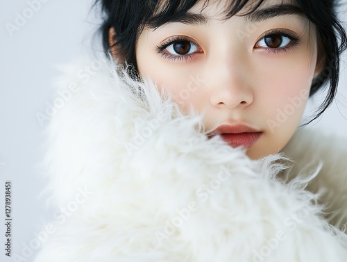 Elegant woman in white fluffy coat in confident pose, beautiful face on pure white background. Studio portraits with soft, bright light and cinematic contrast.