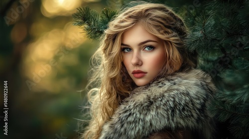 Elegant woman with blonde hair and fur collar outdoors portrait