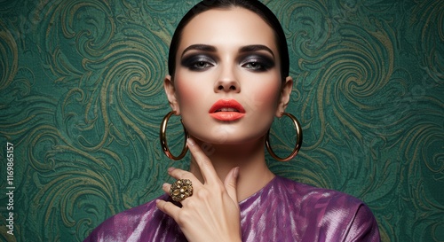 Elegant woman with bold makeup and statement accessories against vintage patterned background