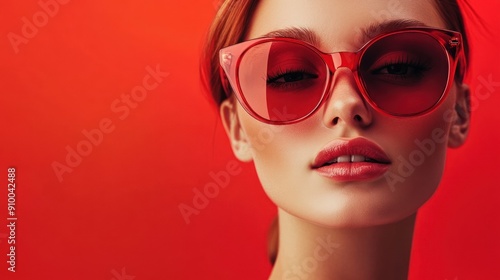 Elegant woman with cat-eye glasses on red backdrop.