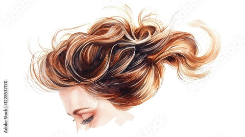 Elegant woman with flowing wavy hair in artistic watercolor style