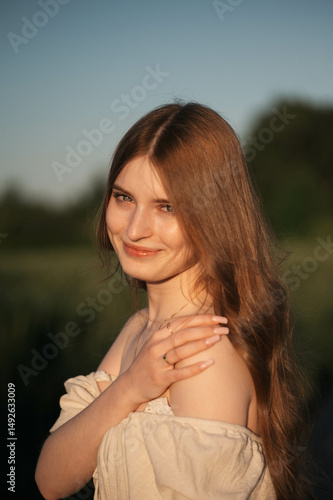 Elegant woman with long dark hair wearing a beige dress in a rural field at sunset, emotional close-up with warm backlight and soft tones, natural beauty in outdoor setting