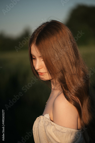 Elegant woman with long dark hair wearing a beige dress in a rural field at sunset, emotional close-up with warm backlight and soft tones, natural beauty in outdoor setting