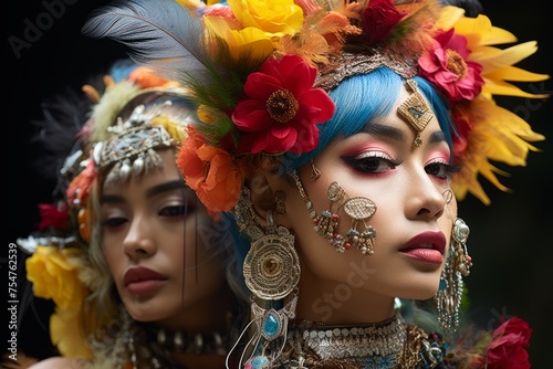 Elegant woman with vibrant makeup and floral headwear in a glamor portrait