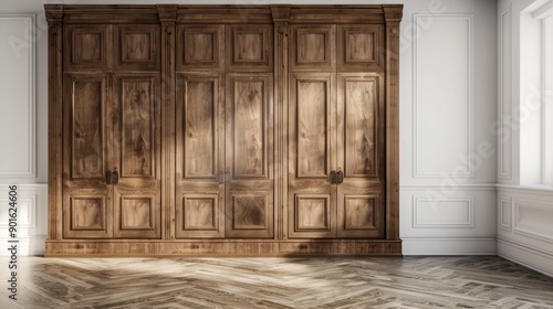 Elegant wood dressing closet, front doorway entrance, and white wall with ample copy space in the room for text or ads