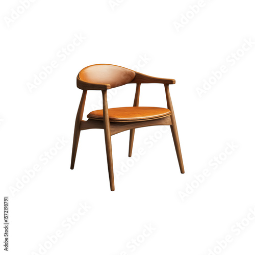 Elegant wooden armchair with brown leather seat isolated on transparent background
