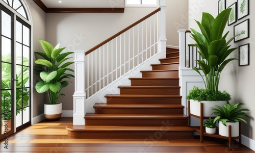 Elegant wooden staircase with lush green plants in modern sunlit hallway