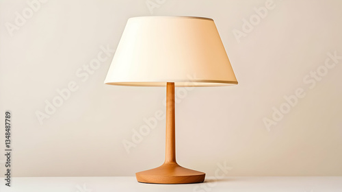 Elegant Wooden Table Lamp with Beige Shade on White Table against Light Beige Wall