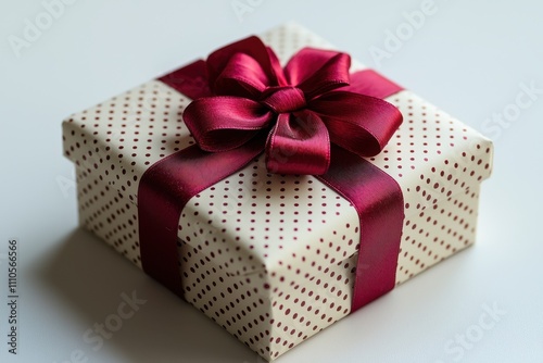 Elegant Wrapped Gift Box with Burgundy Ribbon Isolated on White Background