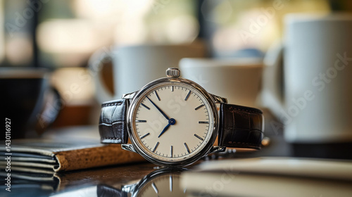 Elegant wristwatch on table surrounded by coffee cups and notebooks