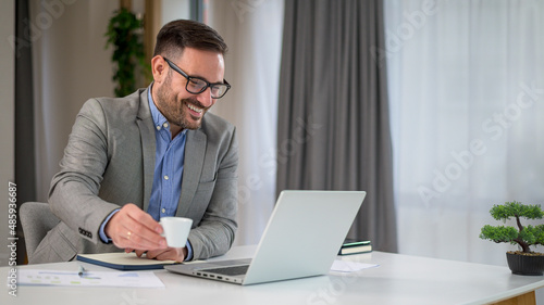 Elegant young manager drinking coffee looking at laptop at office