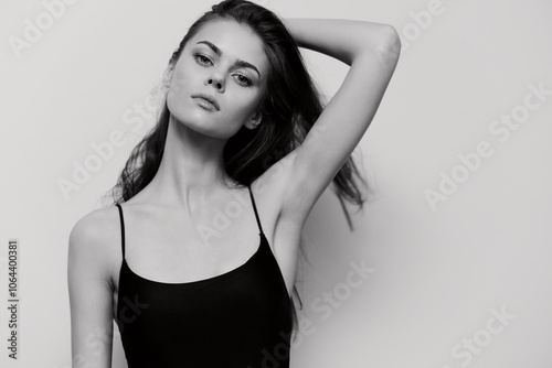 Elegant young woman in black attire posing confidently against a soft gray backdrop, showcasing beauty and poise. Monochrome fashion portrait.
