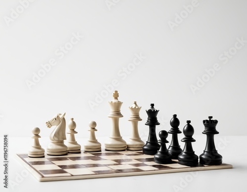 Elegantly arranged chess pieces in black and white on a minimalist chessboard.