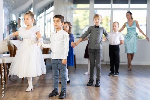 Elegantly dressed children, preteen girls and boys performing curtsy and bow during festive dance event at school, showcasing traditional gesture of etiquette