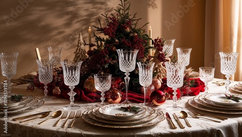 elegantly set holiday dining table with crystal glassware, fine china, and festive decorations