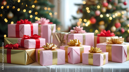 Elegantly Wrapped Christmas Presents in Pink and Gold with Festive Bows Before Blurred Decorated Trees and Warm String Lights