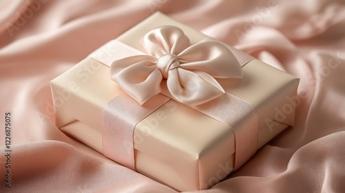 Elegantly Wrapped Gift Box with a Pale Pink Satin Ribbon and Bow on a Soft Pink Background