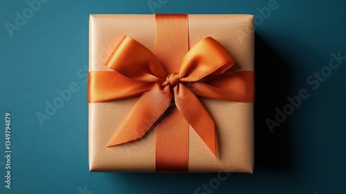 Elegantly wrapped gift with satin ribbon and a bow against turquoise surface